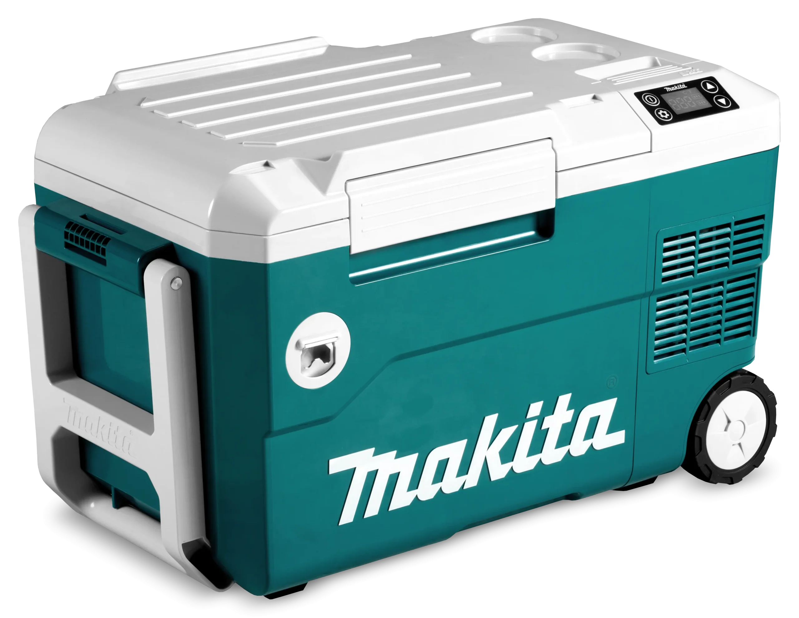 Cooler inalámbrico 18V LXT / 12V/24V DC Alimentado por 3 fuentes: batería de iones de litio LXT de 18 V (dos en paralelo o una), 12 V/24 V CC (enchufe de cigarro), CA El sistema de enfriamiento tipo compresor proporciona una excelente capacidad de enfriamiento Capacidad de refrigeración: -18 a 10 °C, con cinco ajustes de temperatura interior (-18 / -10 / 0 / 5 / 10 °C) Capacidad de calentamiento: Dos ajustes de temperatura interior (55 / 60°C) Gran capacidad de 20 L; Capaz de almacenar hasta cuatro botellas de plástico de 2 L o veinte botellas de plástico de 500 mL Resistencia al agua IPX4 cuando funciona con batería Tiempo de funcionamiento prolongado; 17 / 5 horas en refrigeración a 5 / -18°C, 4 horas en calentamiento a 60°C con dos baterías BL1860B Asa de transporte para el transporte con ruedas Agarres para llevar en las manos Las ruedas grandes de 100 mm funcionan sin problemas para facilitar el transporte Caja de batería equipada con una tapa para protección de la batería contra el agua puerto de salida USB para cargar equipos eléctricos (por ejemplo, teléfonos móviles); Tipo A para DC5V/ 2,4A; Este puerto está ubicado dentro de la caja de la batería, Pantalla LED para una visualización clara de la temperatura interior y el indicador de nivel de carga de la batería Abrebotellas; Convenientemente ubicado para abrir botellas de vidrio Grosor del aislamiento térmico: 33 mm