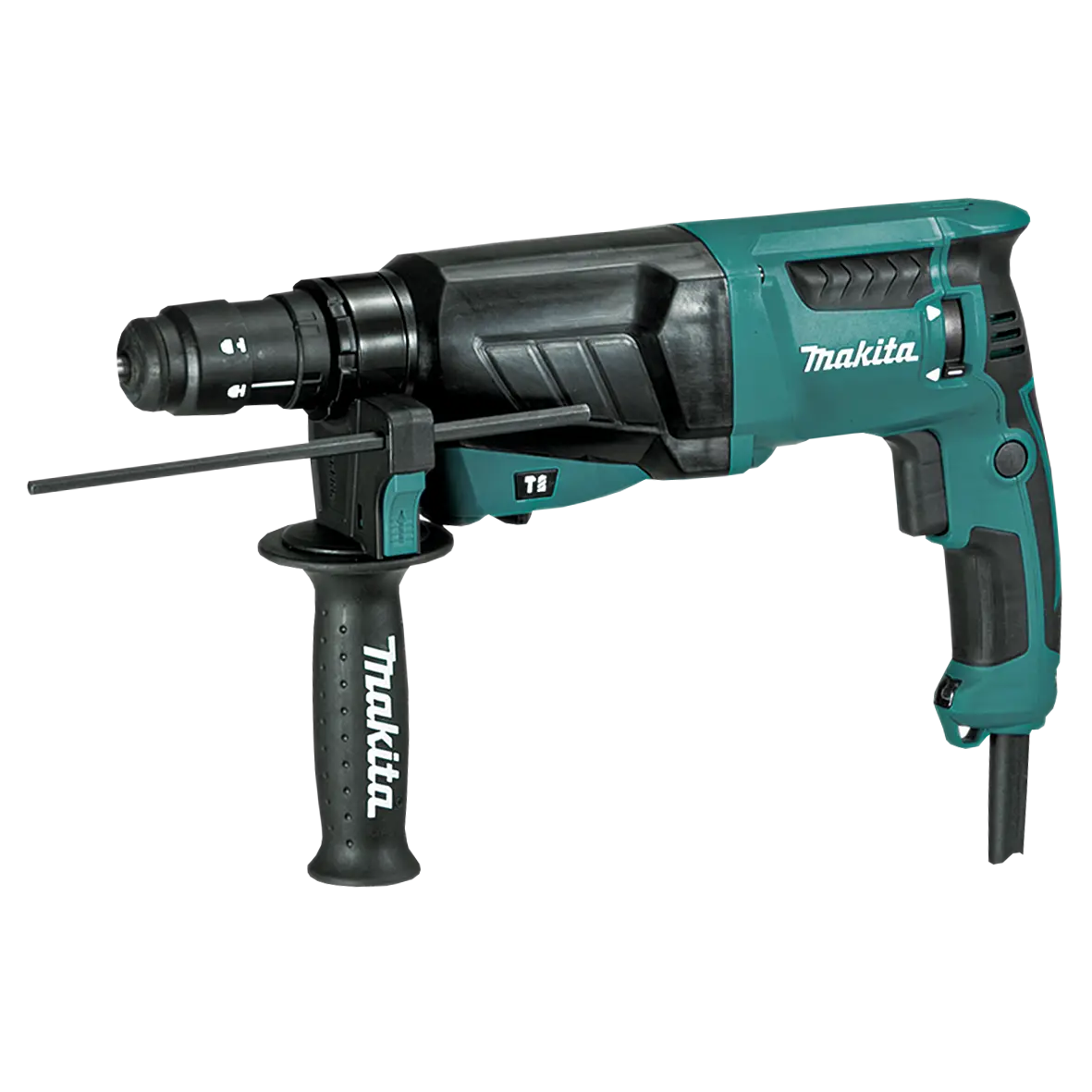 Martillo de combinación de 26 mm (1") 2,4 J, SDS-PLUS Palanca de modo operativo reubicada para mayor protección y durabilidad; permite que el interruptor gire tanto a la izquierda como a la derecha Guía de broca mejorada para una mayor estabilidad de la broca durante las aplicaciones de perforación El mango de fácil agarre proporciona la máxima potencia de empuje y proporciona un agarre seguro y cómodo en cualquier operación; aplicación por encima de la cabeza, perforación con agarre con la palma hacia arriba o hacia abajo El agarre suave proporciona más comodidad y control, Diseño de alta durabilidad con barniz de armadura en zig-zag, sellado mejorado, perno de impacto mejorado y anillo de amortiguación que reduce el impacto Diseño compacto y ligero obtenido al minimizar el peso del motor, con una estructura de herramientas de nuevo diseño El potente motor de 800 W ofrece 2,4 J de energía de impacto para manejar las aplicaciones más exigentes El limitador de par detiene la rotación si la broca se atasca para aumentar la seguridad del operador y mejorar la protección del motor Palanca de avance/retroceso: la posición del interruptor permite colocar los cepillos de modo que el taladro mantenga la misma velocidad y torsión en avance y retroceso Operación de 3 modos para "Solo rotación", "Martillado con rotación" o "Solo martillado" El gatillo de velocidad variable permite al operador ajustar la velocidad según los materiales o la aplicación Los ajustes de ángulo de 40 bits permiten que el bit se establezca en posiciones óptimas Mandril deslizante de un solo toque para una fácil instalación y extracción de la broca Medidor de profundidad para una mayor consistencia de perforación Botón de bloqueo empotrado para uso continuo Recipiente para el polvo opcional conectable a la aspiradora Makita sin piezas de unión Aislamiento doble
