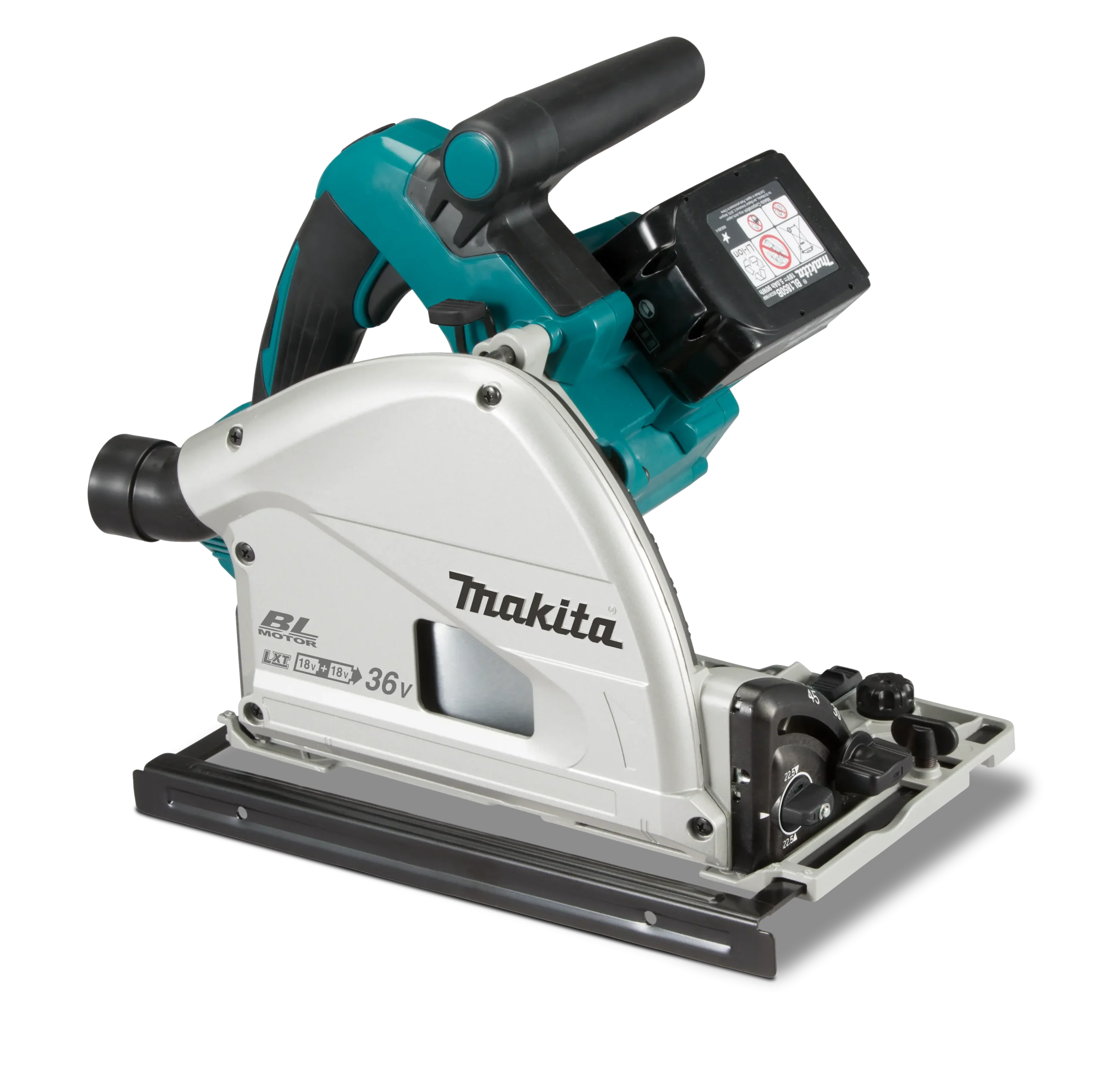 Sierra circular de 165 mm (6-1/2") LXT BL de 18 V X2 (36 V) Corte hasta un 40 % más rápido que el modelo con cable SP6000 Dos baterías de iones de litio LXT de 18 V brindan la potencia y el rendimiento para demandas con cable sin salir de la plataforma LXT de 18 V El motor BL ofrece 6300 RPM para cortar y desgarrar rápidamente Motor BL con alta relación potencia/peso y tamaño El motor BL se controla electrónicamente para optimizar el uso de energía de la batería hasta un 50 % más de tiempo de funcionamiento por carga El motor BL elimina las escobillas de carbón, lo que permite que el motor BL funcione más frío y de manera más eficiente para una vida más larga El motor BL usa energía de manera eficiente para igualar el par y las RPM a las demandas cambiantes de la aplicación La tecnología de accionamiento de par automático (ADT) ajusta la velocidad de corte y el par durante el corte para un rendimiento óptimo Gran capacidad de corte (56 mm a 90º, 40 mm a 45º y 38 mm a 48º) y capacidad de biselado (-1° - 48°) con tope positivo a 22,5° El corte preciso y preciso ofrece un acabado de espejo sin astillas, El tope de profundidad para cortar sin astillas permite cortar fácilmente una ranura preliminar a una profundidad de 2 mm Control de marcación de velocidad variable (2500 - 6300 RPM) para un rendimiento óptimo en una variedad de materiales Función de arranque suave electrónico para arranques suaves Ajuste de profundidad fácil de configurar con escala grande Los componentes de magnesio brindan una sierra liviana y bien balanceada Los soportes biselados delanteros y traseros dobles brindan rigidez adicional para cortes biselados precisos y exactos La palanca de bloqueo mantiene la hoja en posición para que la llave se pueda insertar a través del orificio en la caja de la hoja para facilitar la instalación de la hoja Freno eléctrico para mejorar la productividad y aumentar la seguridad del operador, Mangos de goma para mayor comodidad, El gran puerto de polvo trasero aleja el material del operador y se conecta fácilmente a un sistema de aspiración, El diseño resistente a las puntas minimiza las caídas de la máquina, Llave hexagonal integrada para cambios de hoja rápidos y fáciles, El circuito de protección de la batería protege contra sobrecarga, sobredescarga y sobrecalentamiento, Compatible con riel de guía opcional para una mayor maniobrabilidad